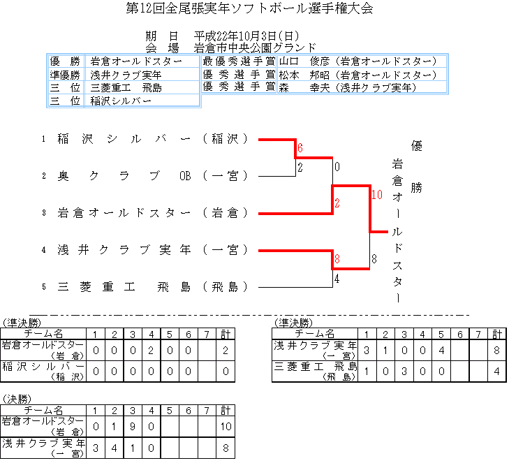 第12回 全尾張実年ソフトボール選手権大会・第16回 全尾張壮年ソフトボール選手権大会の結果は上記の通りとなりました。