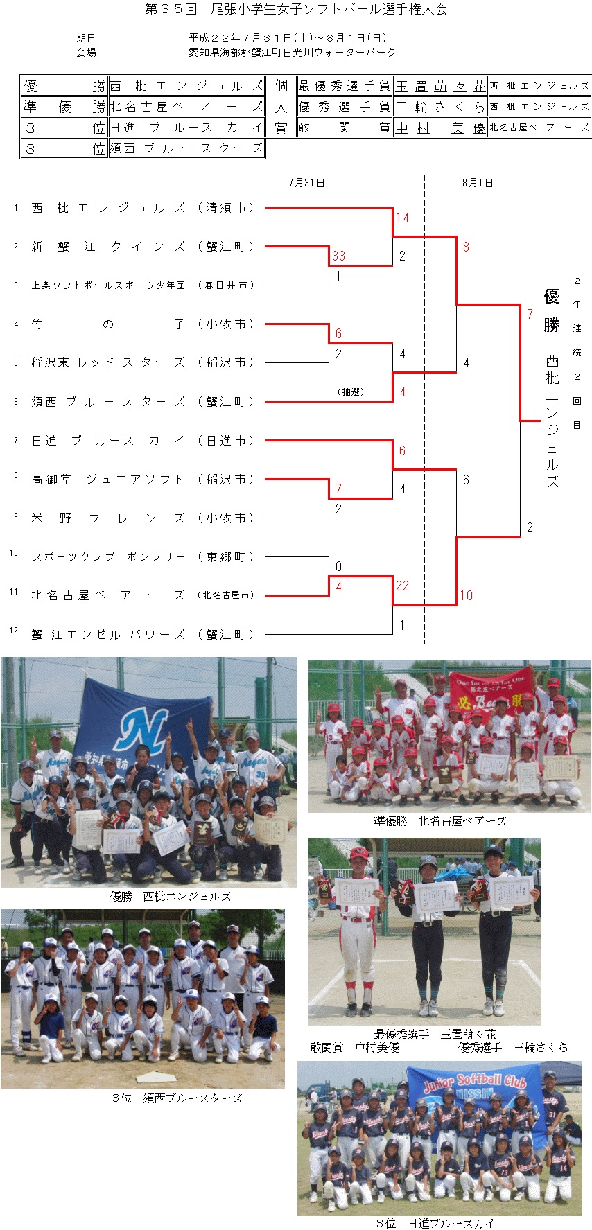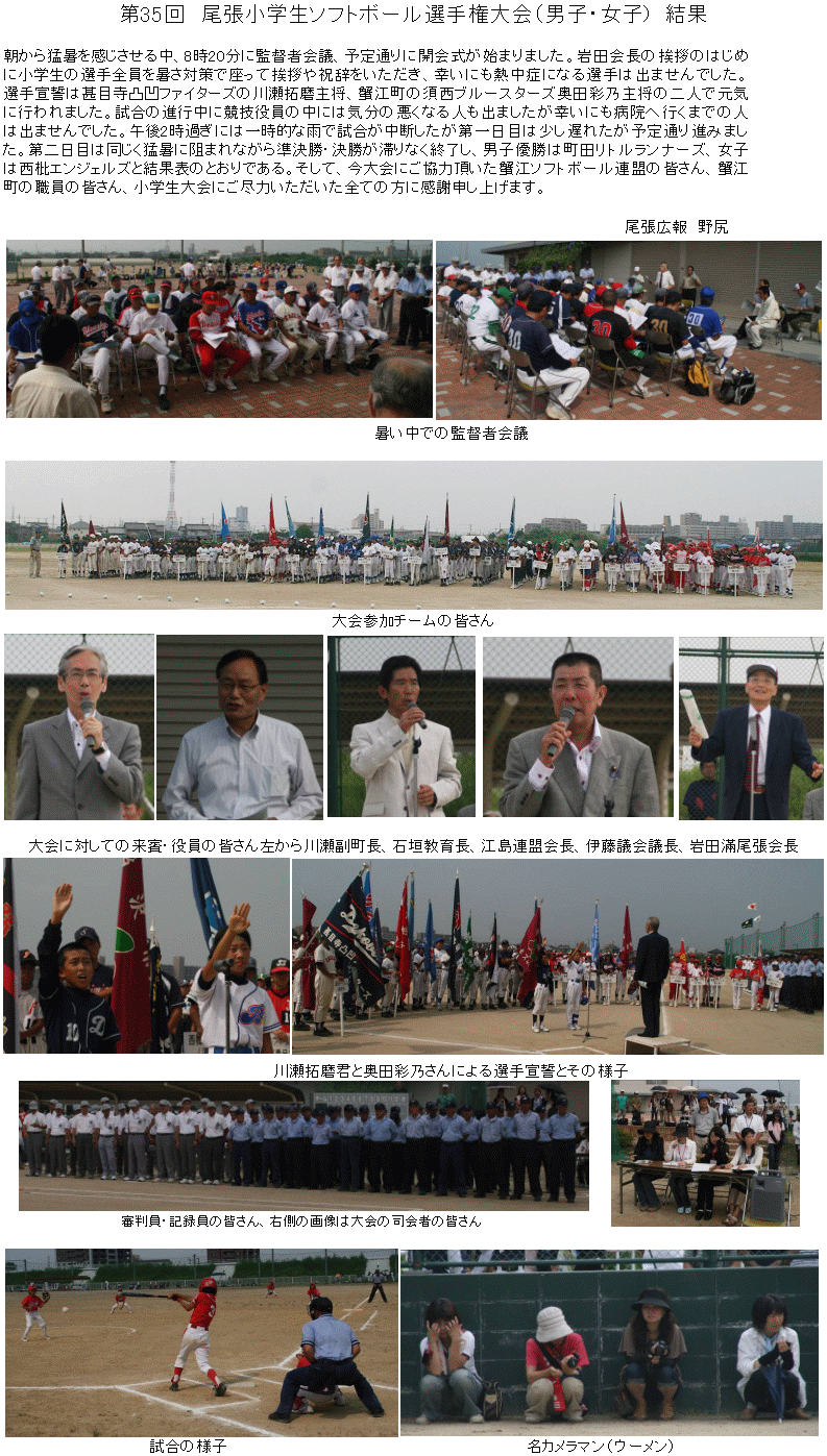 第35回尾張小学生ソフトボール大会は、多くの方々のご支援ご協力により、無事、盛大にそして盛況に終えることができました。結果につきましては上記の通りとなりました。