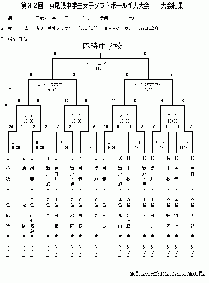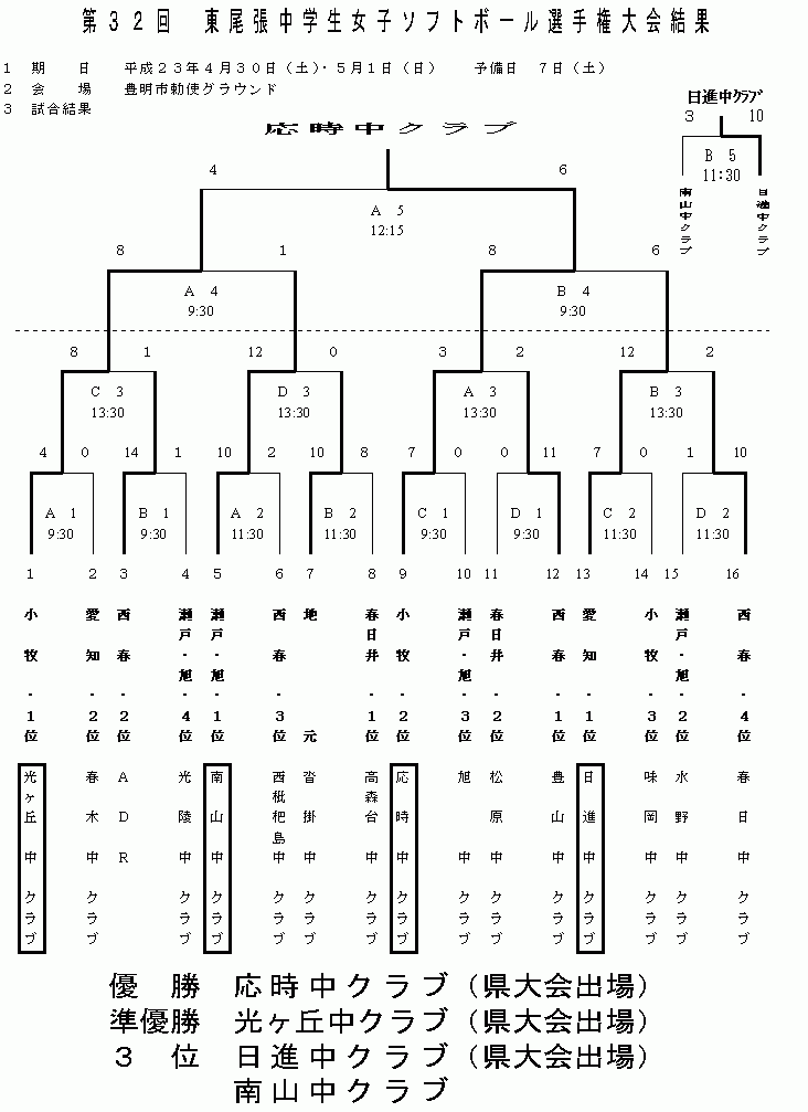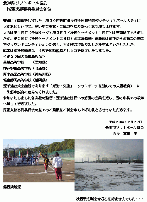 | 第32回 東尾張中学生女子ソフトボール選手権大会は、雨天のために大会二日目が延期しました。東尾張のソフトボールのレベルがどんどん向上しているのを感じるとともに、各中学校の選手達が伸び伸びとプレーしていたのがとても印象的でした。各チームとも充実したよき大会になったこと思います。結果は上記の通りとなりました。 大会を開催するにあたりまして、事前の準備から当日の運営など本当にたくさんの方々のご協力をいただきました。この場をお借りしてお礼を申し上げます。本当にありがとうございました。 東尾張の中学生の多くの人がソフトボールにさらに親しまれることを、祈念しつつ御礼申し上げます。 平成23年 5月 7日 尾張支部 理事(中学校 東尾張) 蛭牟田 弘樹 |
