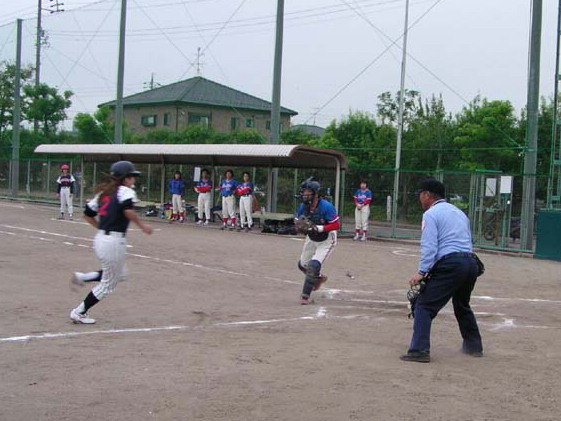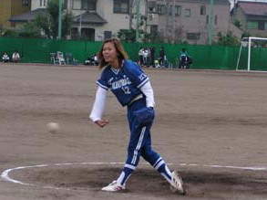 | 力投する江南の鈴木かおる選手 | セーフ一塁審判は稲葉タカ子 |