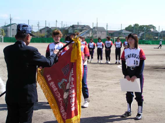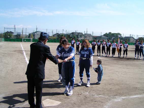 甚目寺女子が2連覇を達成! 後攻の甚目寺は2回裏に打者一巡。安藤の3点本塁打を含む6安打を集中させて、6点を奪って試合の主導権を握った。江南・高屋フレンズも3回表に2安打に敵失をからめて1点を返すも、その後は甚目寺の堀部投手に散発2安打に抑えられ、結局7対1で敗退、涙を呑んだ。 甚目寺女子は12安打を放つ攻撃力に加え、敵失に乗じた卒の無い攻めが光った。また、特に内野手の堅い守備力が目を引いた。 最優秀選手賞は、甚目寺女子の安藤ひとみ選手に贈られた。 |