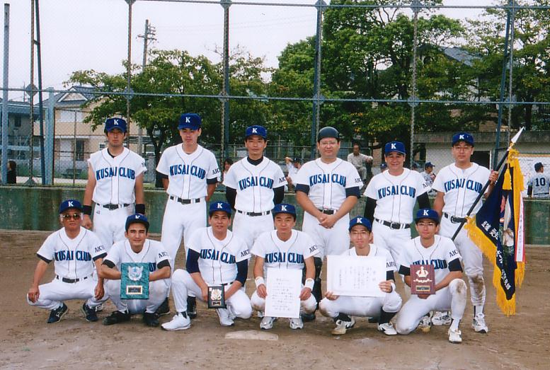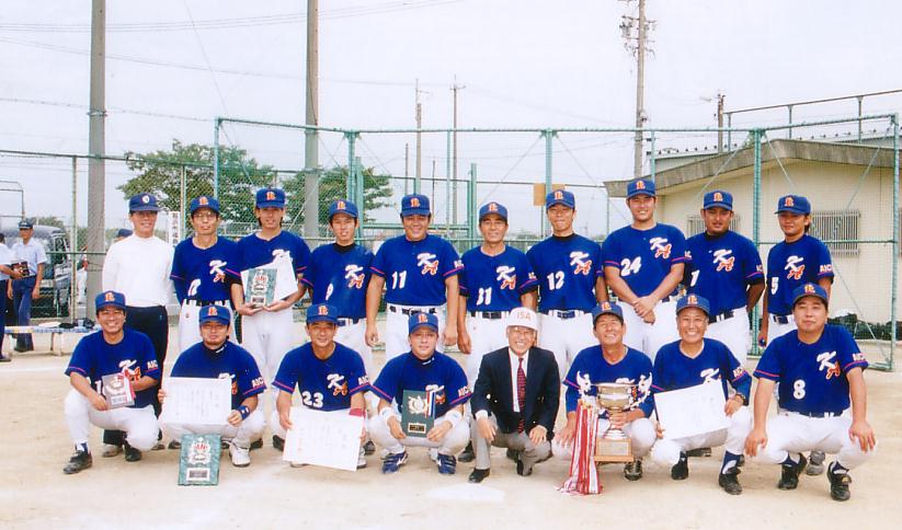 尾張のチャンピオン決定 宮中クラブ優勝 十月二十七日江南市緑地公園木曽川グランドで、尾張全域より二十九チームが参加し、盛大に開会式が行われた。始めに岩田会長の挨拶があり、引き続き江南市市長、県会議員、役員各位の激励の挨拶をいただき、そして、地元宮中クラブ主将片渕聡が選手宣誓を行なった。また一回戦では、久保目ソフトクラブの三輪弘 投手があわやノーヒットノーランかと思われる快投も あり、各グランドで熱戦が繰り広げられた。 |