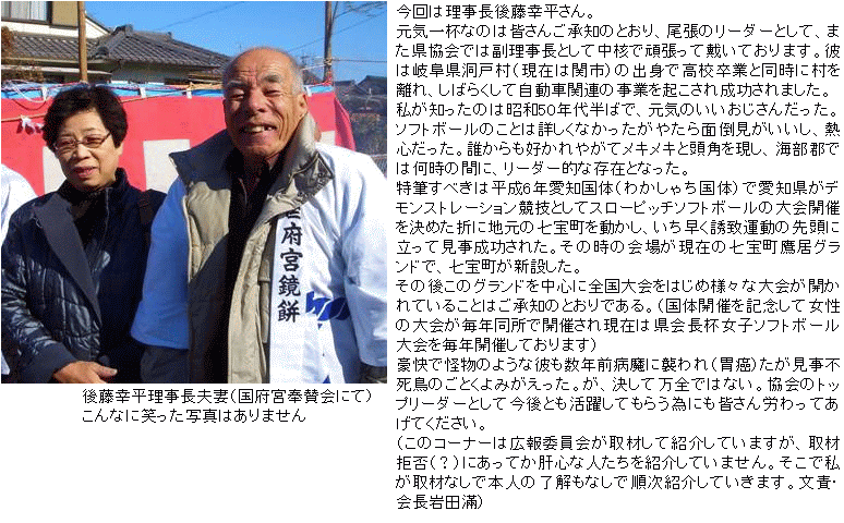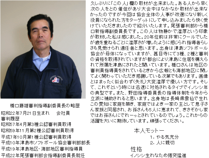 平成21年度の尾張支部審判部の総会・伝達講習会では、司会・設営準備と忙しく活躍されていた、平子尾張審判部事務局長に登場していただきます。この人(失礼、平子事務局長)はいうまでもなく、平成20・21年度の尾張支部審判部事務局長で、尾張地区の審判員の派遣・審判部の事業においての実務を担当されている大切な方です。ソフトボールの経歴は町内会(一宮市)の消防団員相互の親睦を図る目的で、組織された「小山119クラブ」に20代より所属され活躍されていました。地元ではイチイチキューで呼ばれています。このソフトクラブでの監督時代に、愛知県大会で3位になったことを誇りにされています。現在は審判活動が忙しく引退されています。ご本人からの報告ですが性格はまじめ、揉め事は嫌い、何事もまぁーまぁーで見過ごし、いつも反省しています。(ご謙遜)そして、平子さんの家庭を覗かせていただきました。職業は日本ガイシ(株)小牧製造所を定年され、継続勤務されています。ご結婚は昭和48年に同じ町内で奥様を見つけられ、跡継ぎ農家の奥様の方に惚れて行かれました。当時、町内では大変評判ではなかったかと推測されます。お子様は2人で既に結婚されています。趣味は家庭菜園(楽農)ならぬ機械化農業だそうですが田畑の管理と作付けは大変ですよ!審判部の裏方で一番大変な部署ですが、これからもソフトボール競技普及、協会、審判部のために頑張って下さい。 |