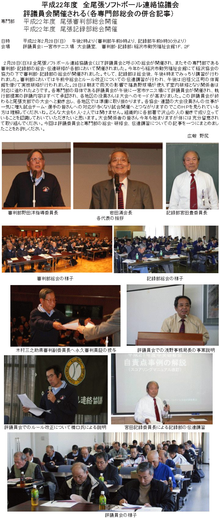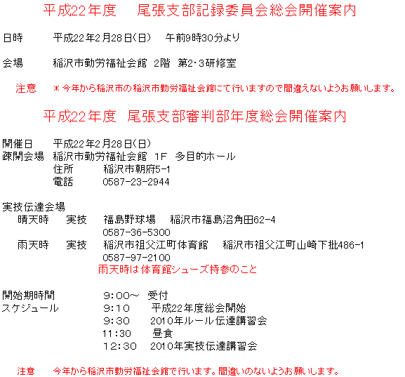 平成22年度 全尾張ソフトボール連絡協議会 評議員会開催案内 |